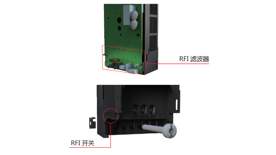 全系內(nèi)置C3等級(jí)的RFI濾波器(可通過RFI開關(guān)選擇是否連接),可以減小電磁干擾,使變頻器EMC性能達(dá)到二類環(huán)境(工業(yè)環(huán)境)不受限制使用。