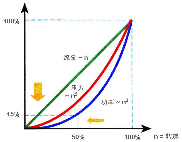 正如前面提到的,軸功率P與轉速n的三次方成正比。采用變頻器進行調速,當流量下降到80%時,轉速也下降到80%,而軸功率N將下降到額定功率的51.2%,如果流量下降到60%,軸功率N可下降到額定功率的21.6%,當然還需要考慮由于轉速降低會引起的效率降低及附加控制裝置的效率影響等.即使這樣,這個節能數字也是很可觀的,因此在裝有風機水泵的機械中,采用轉速控制方式來調節風量或流量,在節能上是個有效的方法。