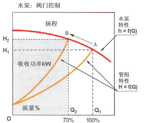 電機在恒速運行時,采取調節閥門的辦法獲得70%的流量(工作點為 B),將導致管阻增大,水泵軸功率相當于Q2BH2O所包容的面積,所以軸功率下降不大。