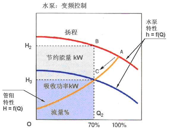 采用變頻調速控制流量時,由于管道特性沒有改變,水泵特性發生變化(工作點為 C),軸功率與Q2CH3O所包容的面積成正比。故其節能量與CBH2H3所包容的面積成正比,輸入功率大大減小。 如圖3所示: