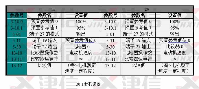 2、若1#機(jī)故障停機(jī),端子27無高電平輸出,2#機(jī)則激活預(yù)置參考值0,以100%速度運行;