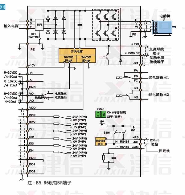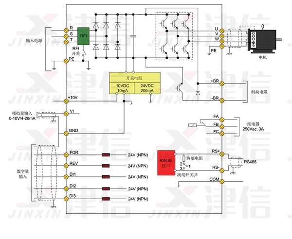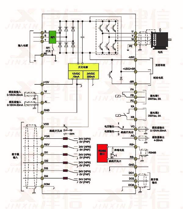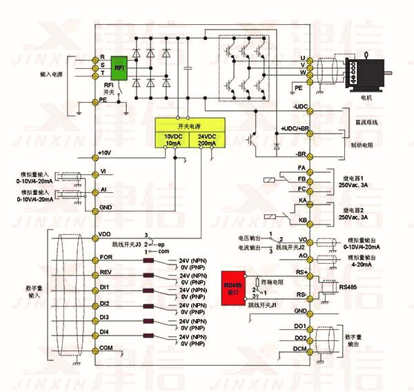 海利普變頻器主要由整流、濾波、逆變、驅(qū)動(dòng)單元、制動(dòng)單元、檢測(cè)單元微處理單元等組成。采用交-直-交工作原理,首先將三相交流電經(jīng)整流模塊變換成直流,再進(jìn)行濾波后,通過(guò)IGBT等其它電力電子器件逆變成頻率和電壓均可變的三相交流電供電機(jī)使用。同時(shí),通過(guò)IGBT的開(kāi)斷調(diào)整輸出電源的頻率和電壓,從而達(dá)到調(diào)速、節(jié)能的作用。以下是海利普各系列變頻器的接線示意圖。