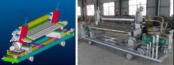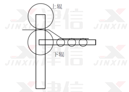 如圖中所示:設(shè)備采用了上下兩個(gè)壓輥,玻璃從兩個(gè)壓輥中間經(jīng)過,完成壓延。在壓延過程中兩個(gè)輥需要同步,使玻璃平滑。