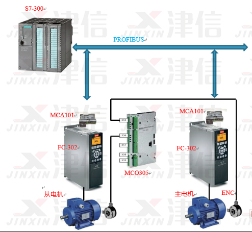 PLC與丹佛斯FC302變頻器之間進(jìn)行PROFIBUS通訊,通過PLC可以設(shè)置同步功能、非同步功能、等工藝參數(shù);FC302變頻器控制從機(jī)電機(jī),以保證出標(biāo)精度及響應(yīng)精度。 變頻器通過MCO305運(yùn)動(dòng)控制卡,實(shí)現(xiàn)角度同步控制。MCO305運(yùn)動(dòng)控制卡內(nèi)要編程,接收現(xiàn)場(chǎng)總線控制命令,發(fā)送各種狀態(tài)信號(hào),實(shí)現(xiàn)各種控制,如單機(jī)運(yùn)行/同步運(yùn)行模式切換,判斷從機(jī)編碼器故障等。