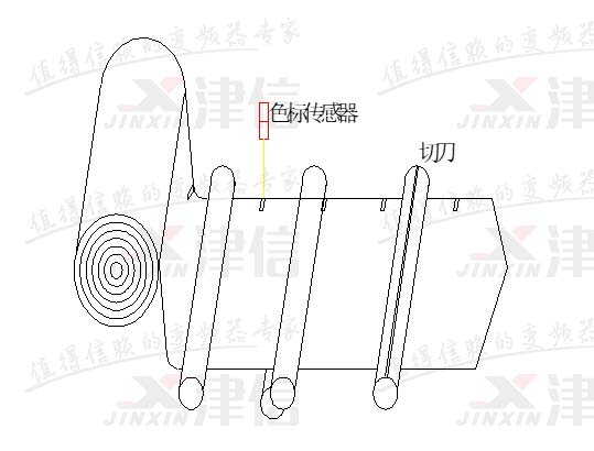 送膜控制有定長送膜和色標對標送膜兩種情況。定長送膜,只需根據主軸編碼器信號,主軸轉一圈(輸送一個物料),送膜部分輸送一段固定長度的膜即可,不需動態調整;色標對標送膜,不但要求主軸轉一圈輸送一段固定長度的膜,還要求膜上的色標點正好落在主軸的設定相位點上,以使橫切刀能精確地切在色標點上。因此色標對標送膜還需要根據檢測到的實際色標相位差,在生產過程中動態調整送膜電機的相位。