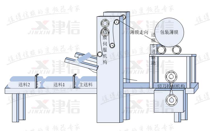 枕式包裝機主體由送料部分、送膜部分和裁切部分構成。送料為主機,橫切刀與送料之間的位置關系固定,因此可以用電子凸輪控制橫切刀送料部分包括一臺主軸編碼器,編碼器旋轉一圈正好對應送料輸送一個物料。