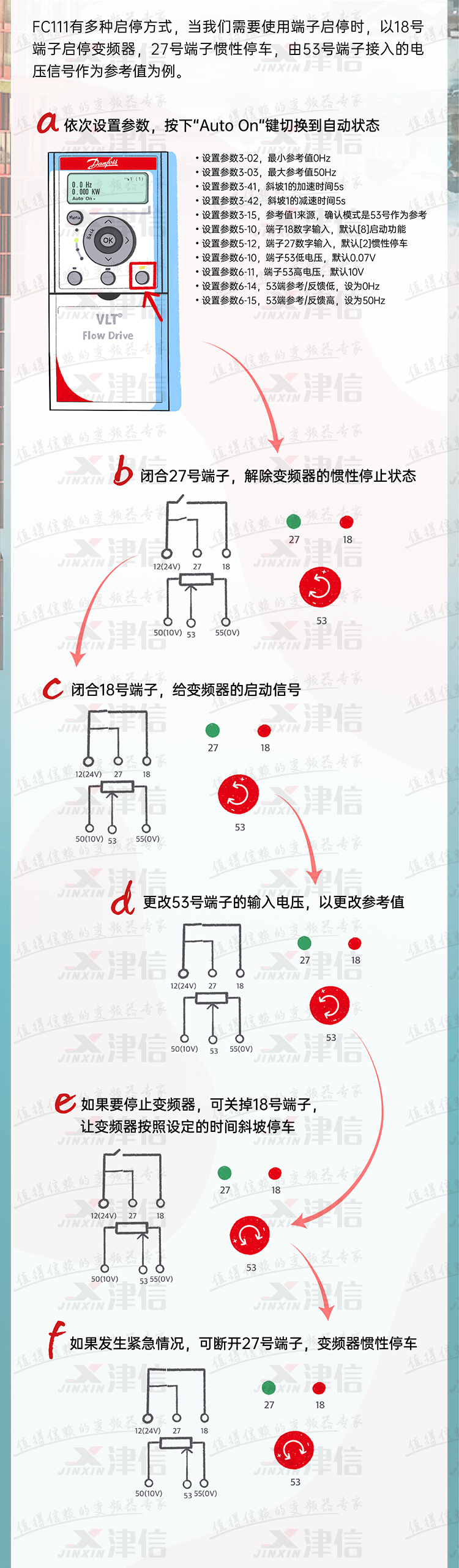 丹佛斯變頻器有多種啟停方式,以丹佛斯FC111變頻器為例,當(dāng)我們需要使用端子啟停時(shí),以18號(hào)端子啟停變頻器,27號(hào)端子慣性停車,由53號(hào)端子接入的電壓信號(hào)作為參考值為例。