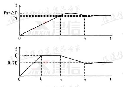 目前,變頻螺桿空壓機(jī)的運(yùn)行頻率大多是由變頻器根據(jù)用戶設(shè)定的期望壓力和供氣端反饋的實(shí)時(shí)壓力的差值進(jìn)行自動(dòng)調(diào)節(jié)。當(dāng)供氣端反饋的實(shí)時(shí)壓力超過用戶設(shè)定的期望壓力時(shí),變頻器減小輸出頻率,反之,則增大輸出頻率;而當(dāng)供氣端反饋的實(shí)時(shí)壓力等于用戶設(shè)定的期望壓力時(shí),變頻器維持當(dāng)前輸出頻率。圖3給出了λ = 0.7,Q0 = 10Q1 時(shí)變頻螺桿空壓機(jī)的供氣壓力和變頻器輸出頻率變化關(guān)系趨勢圖。從圖3中可以看到, 變頻螺桿空壓機(jī)起動(dòng)后其輸出頻率平穩(wěn)上升至額定頻率fe(軟起動(dòng)方式,起動(dòng)時(shí)間t0可調(diào)),然后維持額定頻率運(yùn)行,供氣壓力也隨之上升,當(dāng)壓力上升到用戶設(shè)定的期望壓力ps時(shí)(t1),空壓機(jī)輸出頻率開始下降,由于慣性壓力還會(huì)有一點(diǎn)超調(diào)量Δp,通常 Δp<5%ps。隨著輸出頻率繼續(xù)下降,空壓機(jī)的供氣量也隨之下降,供氣壓力最終降至期望壓力ps處,這時(shí)輸出頻率也維持相對穩(wěn)定狀態(tài)。在變頻螺桿空壓機(jī)的運(yùn)行中,一旦出現(xiàn)供氣量發(fā)生變化導(dǎo)致供氣壓力變化時(shí),變頻器會(huì)立即調(diào)節(jié)輸出頻率使供氣壓力維持在ps處。總之,對于變頻螺桿空壓機(jī)來說,除非它的供氣量是絕對不變的,否則其運(yùn)行過程就是一個(gè)動(dòng)態(tài)平衡過程,就是系統(tǒng)的輸出頻率在上限和下限頻率之間不斷地變化以尋求氣量供需平衡的過程。