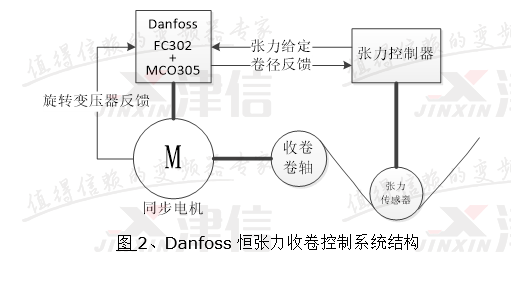 丹佛斯收卷張力控制系統由Danfoss驅動器(內置MCO305運動控制卡)、永磁同步電機和張力檢測控制器構成,如上圖2所示。張力檢測控制器根據卷徑信號和張力傳感器的反饋信號,輸出一個模擬量作為丹佛斯驅動器的張力參考值,丹佛斯驅動器負責驅動永磁同步電機,工作在閉環轉矩控制模式下。永磁同步電機轉子軸上安裝旋轉變壓器作轉子角度位置反饋。