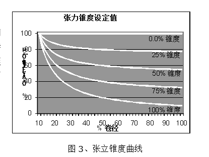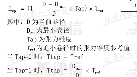 收卷張力錐度控制:有了當前卷徑值,和張力錐度設定值,就能計算當前張力。張力與卷徑的關系如圖3所示,當張力錐度為0時,張力保持恒定不變,相當于恒張力控制;當張力錐度為100%時,卷徑每增大1倍,張力就下降一半,相當于恒轉矩控制。計算公式如下: