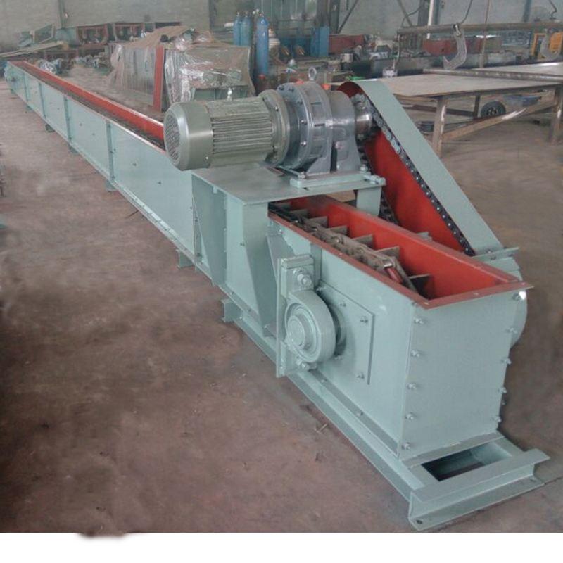 物料經(jīng)設(shè)備進(jìn)料口均勻的進(jìn)入槽體底部,由從機(jī)尾向機(jī)頭方向作封閉連續(xù)運(yùn)行的承載刮板輸送鏈講物料從進(jìn)料口處連續(xù)均勻的輸送至出料口排除,可實(shí)現(xiàn)多點(diǎn)進(jìn)料、多點(diǎn)卸料。