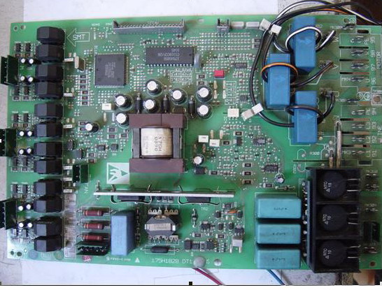 由于這幾臺VLT3000變頻器是小功率的,因此拆裝非常的方便。先檢查變頻器的主回路,測量整流模塊和逆變模塊特性良好。給變頻器的輸入端送交流電,發現變頻器的操作面板沒有顯示。等變頻器主回路上直流電壓釋放完全后,將變頻器的上蓋板拆下,接下來就露出來變頻器的控制卡,拆除變頻器控制卡上的兩根電纜連接線,取出控制卡。變頻器ILD卡就出現在我們的面前。將變頻器的ILD卡取出來做單板測試,發現變頻器操作面板沒有顯示,確定變頻器的ILD卡損壞。
