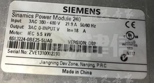 用戶送修一臺西門子G120變頻器到上海津信變頻器維修中心,型號為6SL3224-0BE25-5UA0,故障現象是送電無顯示。以下是功率單元銘牌信息: