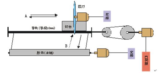 主軸電機(jī)用VFD-015M23A驅(qū)動,切臺上的圓刀(切刀)用VFD-007M23A驅(qū)動,伺服與齒輪同軸相連,通過齒輪皮帶帶動導(dǎo)軌,使切臺在如圖中A所示方向來回移動,用來完成定長的操作。同時(shí)切臺通過油壓可以在如圖中B所示方向前后移動,用來對套在主軸上的膠帶進(jìn)行切割。