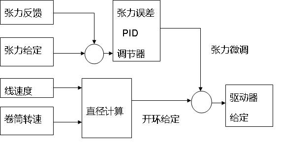 由于采用以上技術方案,使得排線平整,進而使收線伺服的控制是典型的中心卷繞控制。中心卷繞控制原理框圖如圖3所示。根據收線伺服當前實際轉速計算需要的開環給定量,同時通過跳舞輪反饋引入張力調節,最終確定收線伺服驅動器的給定量。
