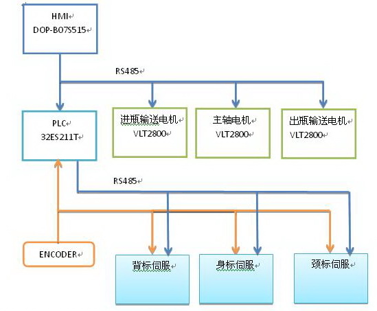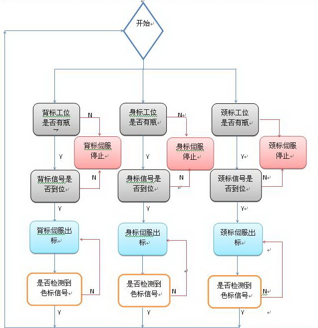 啤酒貼標機由進瓶傳送帶、主軸、出瓶傳送帶、貼標伺服及各個位置傳感器組成。當設備運行時,系統會檢測當前貼標工位是否有瓶子,如有,則對應得貼標伺服開始動作。例如當系統檢測到背標工位上有瓶子,且貼標有貼標信號時,則貼標伺服開始動作,由色標檢測傳感器來結束貼標動作,身標與頸標動作與背標一致。