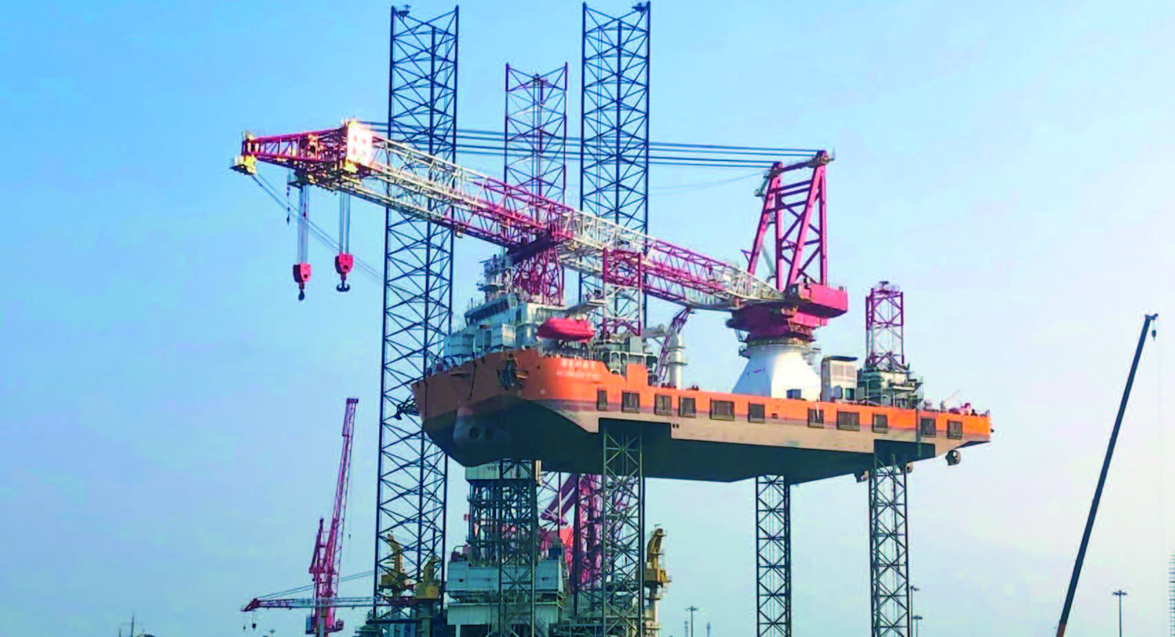 “海龍興業(yè)”號風電安裝平臺是目前國內(nèi)最新型高端風電安裝平臺,是我國第一座采用桁架式齒輪齒條升降設計的平臺,可用于7兆瓦及以下海上風機的安裝作業(yè)。