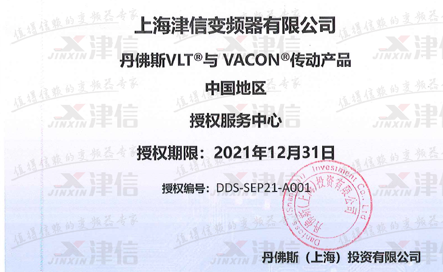 2021年上海津信丹佛斯和偉肯變頻器服務中心授權證書